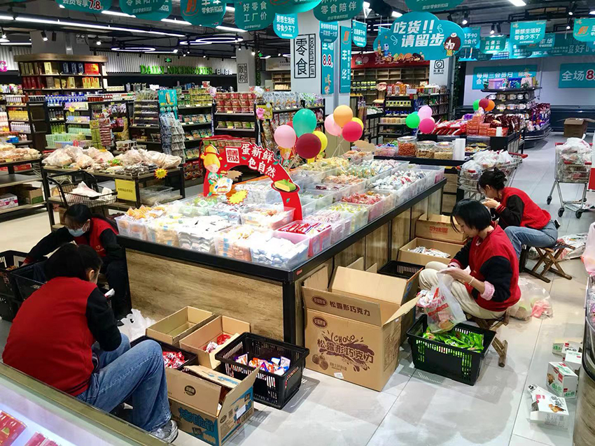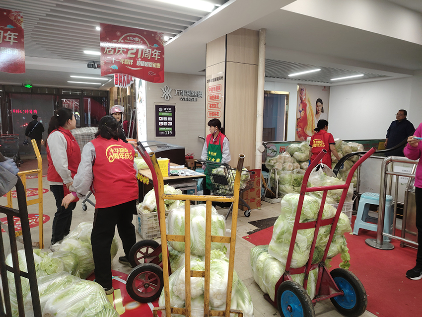 二十一周年慶期間,民生店同事們齊心協(xié)力,加班加點(diǎn)提前將店慶福利贈(zèng)品大白菜擺放在兌獎(jiǎng)處,以便顧客兌換領(lǐng)取。