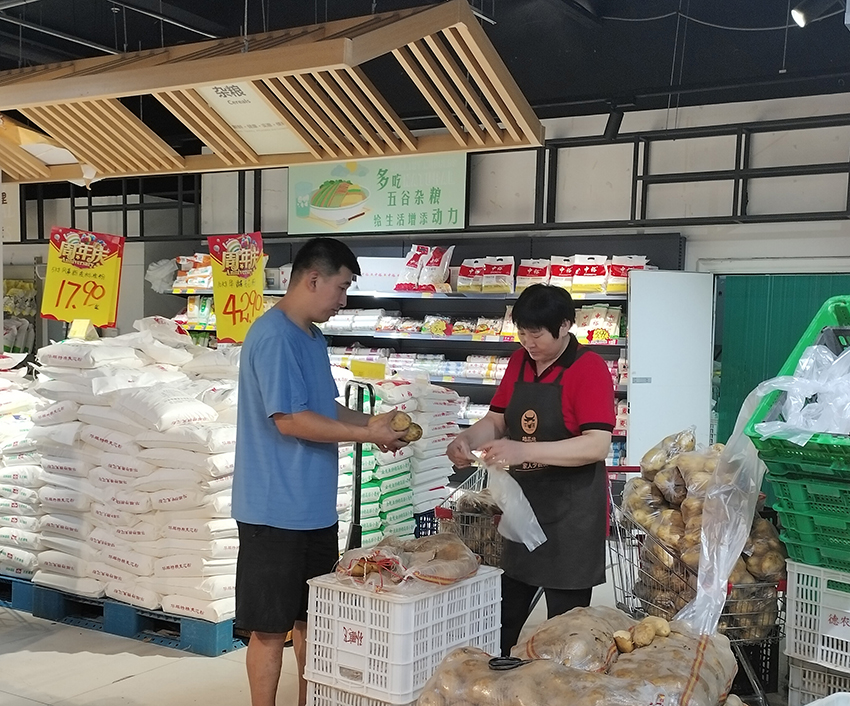 店慶期間,高新店同事們?yōu)榉奖泐櫩桶葱栀徺I、減少排隊時間,利用中午休息時間提前將土豆分級裝袋。