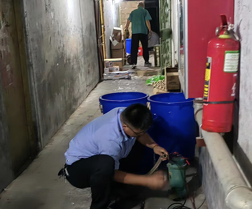暴雨期間,安保部加強(qiáng)防汛檢查,發(fā)現(xiàn)積水后,及時攜帶抽水設(shè)備協(xié)助保潔員迅速清理,排除安全隱患。